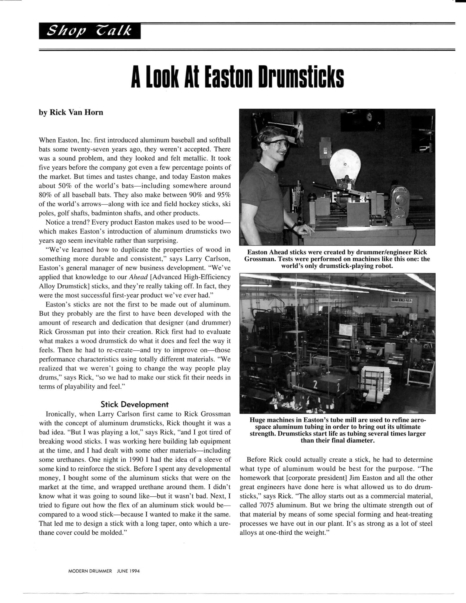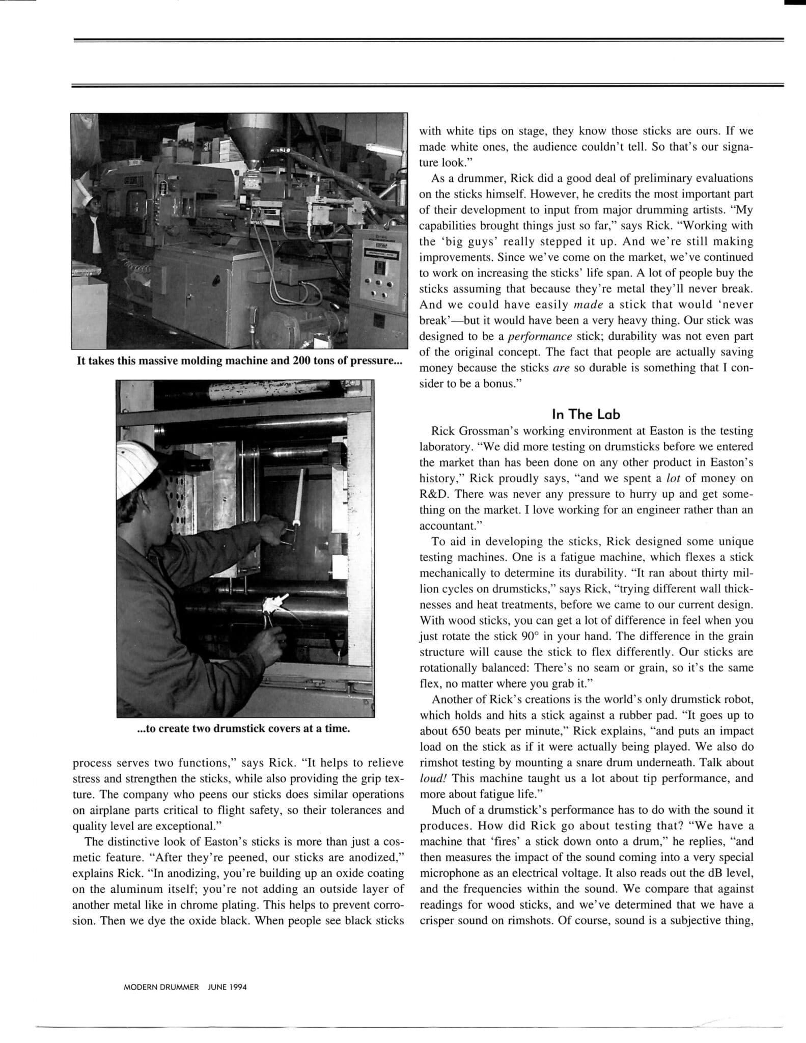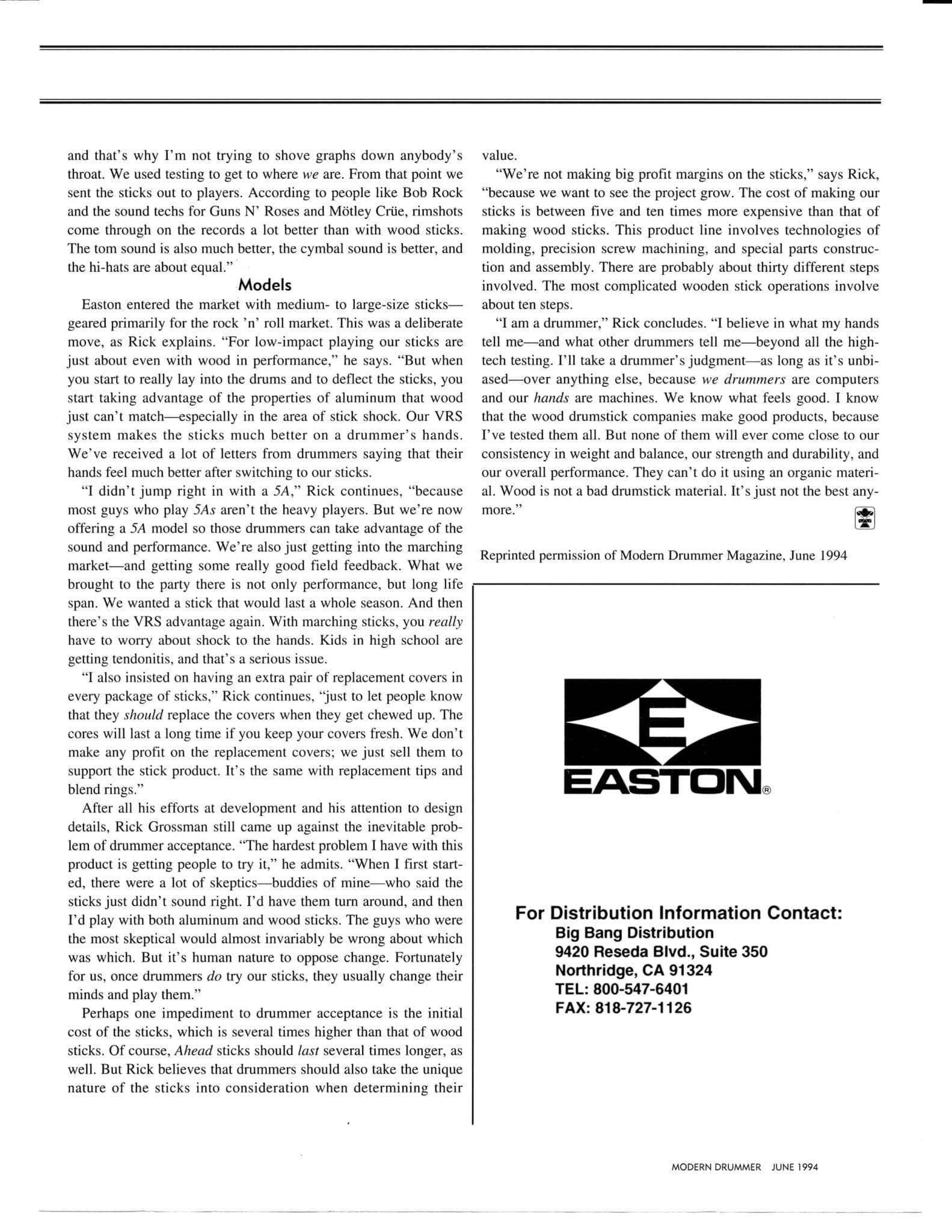 The collaboration with Rick Grossman and Easton Sporting Company marked a turning point for Bob and the drumming world. The development of AHEAD drumsticks represented a radical departure from traditional wooden drumsticks. The engineering approach applied to the drumsticks, using a hi-tech aluminum core with replaceable nylon sleeves and tips, was influenced by aerospace technology, making the sticks more durable and providing a unique playing experience. The product's innovative design quickly garnered attention, especially among professional drummers who sought performance improvements, laying the foundation for Big Bang’s future distribution efforts.