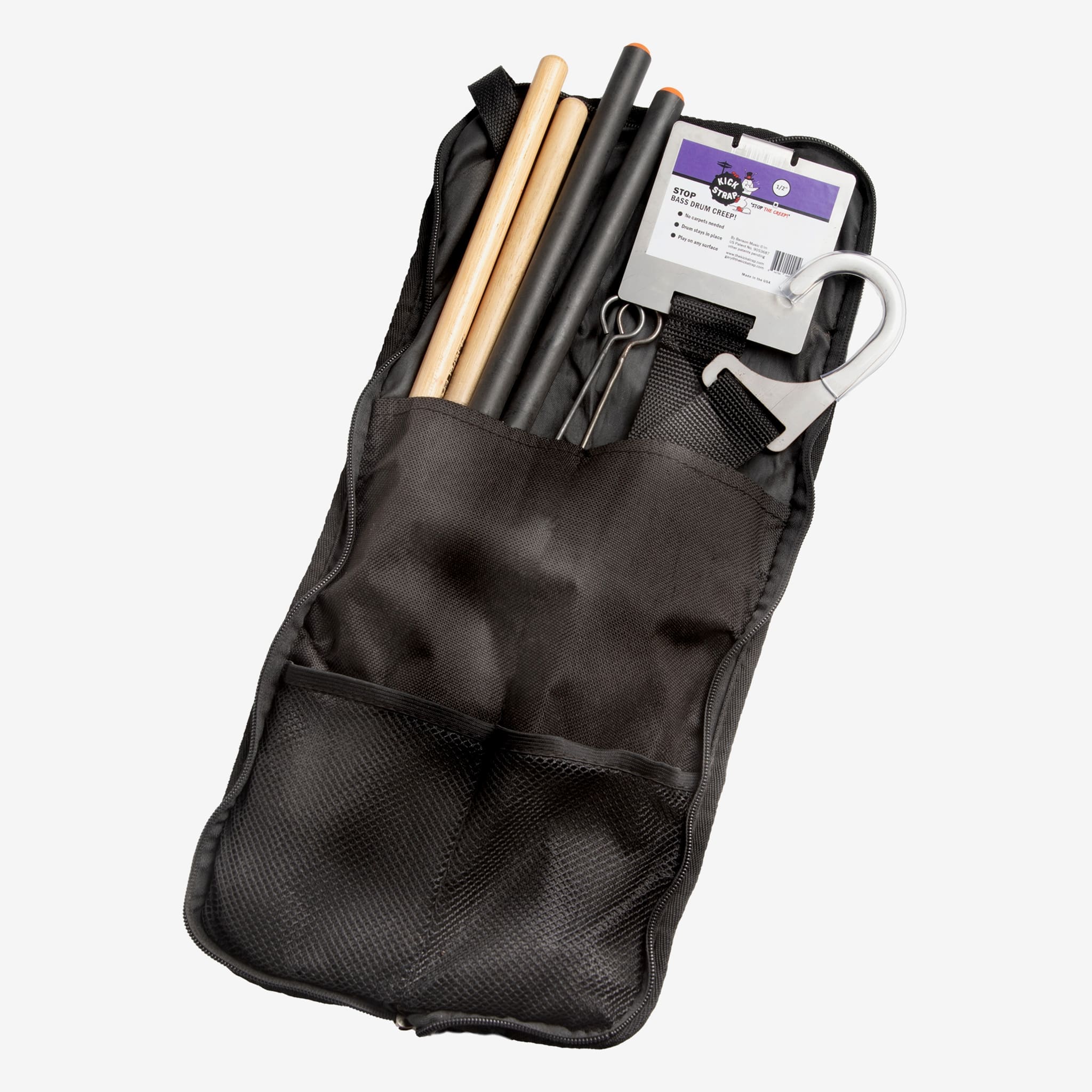 KickStrap is the definitive, compact drum and pedal anchor that stops your kick drum, hi-hat, and auxiliary pedals from sliding on any surface. No carpet or velcro needed. Just clip it on, adjust the length, and keep your setup from moving during your performance. The High Rise version is designed for pedals and stands with a 1/2" thickness at the very front (the section immediately under the pedal tongue clamp), which is the size most hi-hat stands typically use. Built with an improved heavy-duty hook and compact enough to fit in your stick bag or pocket, KickStrap keeps your gear locked in place with no extra fuss.